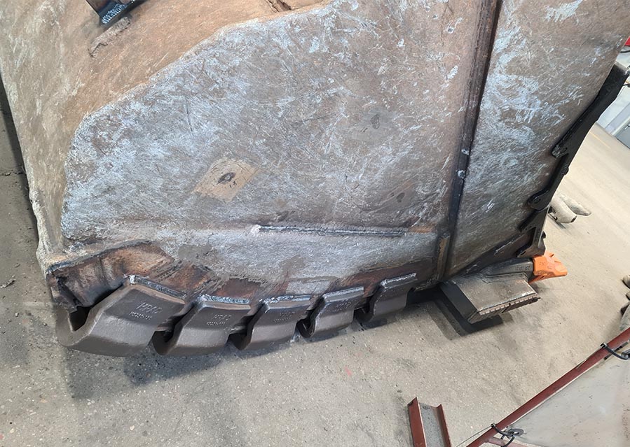 Skuffen ble opp sveiset av kundens faste sveiseverksted. Der ble det inn sveiset nye hold for sidebeskyttere, med nye sidebeskyttere. Lagt inn forsterkning både innvendig og under skuffen med slitestrips. Nye 20kg hjørnebeskyttere. +Chockybars for beskyttelse. Alt dette var også levert av oss i Entrack AS.