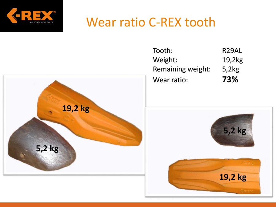 Vi fikk forespørselen fra en god kunde av oss om alternativ til renovering av en skuffe til Caterpillar 390D med en skuffe på 6500l. Vi anbefalte tannsystemet C-REX fra Combi Wear Parts. C-REX er et patentert system som vi har agenturet for i Norge. Tennene blir støpt i Ljungby i Sverige. De er innovative med en god passformog en enkel låsning. Tannen/tannholderen er slank, dette gir bedre pennetrasjon og lavere drivstoff forbruk/lengere levetid. Tennene produseres med grønn energi og er kortreist for oss i Norge. Ifølge tester gjort tidligere holder denne seg spissere i forhold til mange andre alternativer som finnes på markedet. Dette gjør at den gode penetrasjonsevnen holder seg bra til tannen er nesten helt utslitt