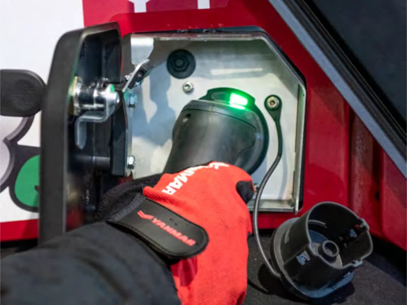 Det er ekstremt enkelt å lade V8e. Bare slå av maskinen, ta med deg maskinnøkkelen, lukk førerhuset, åpne ladeluken, koble ladekabelen til strømforsyningen og koble Type 2-pluggen til ladeuttaket på venstre side av maskinen. For å stoppe ladingen trenger du bare å åpne førerhuset, trykke på bryterknappen nedenfor, som er tilgjengelig uten å gå inn i førerhuset, og deretter koble Type 2-kabelen fra maskinen.
