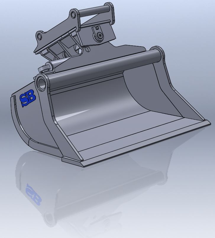 Planeringsskuff med hydraulisk tilt, med 2 hydrauliske stempler (hydraulkolvar). Planeringsskuffen kan fåes med slitejern: 10mm, 12mm, 15mm eller 20mm i 500 brinell.