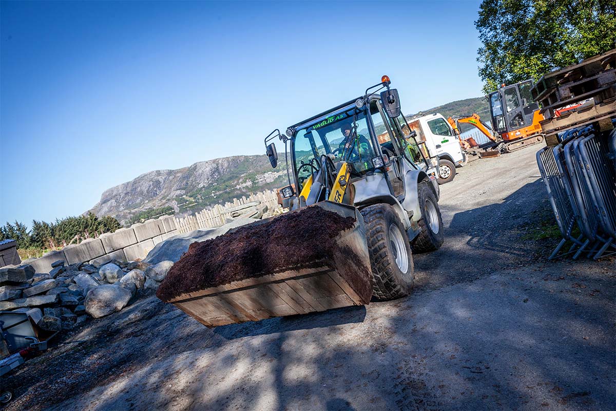 De fire hjullasterne spenner fra to til fem tonn, hvorav maskinfører Einar Vaglid styrer den nest tyngste arbeidshesten – den fire tonn tunge 5075.